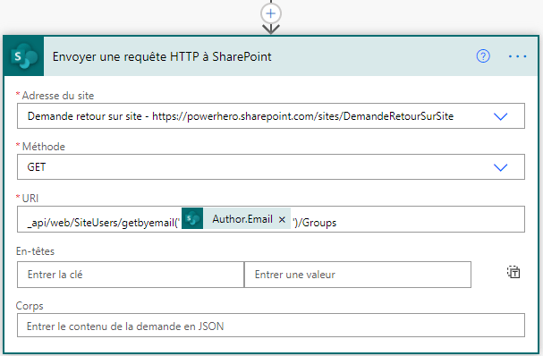 3. Obtenez les groupes de l’utilisateur avec l’action : « Envoyer une requête HTTP à SharePoint ».