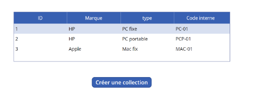 Vous pouvez créer une collection manuellement ou obtenir des données à partir une source de données externe (SharePoint, Excel, Dataverse, SQL, …) à l’aide de la fonction « ClearCollect ».